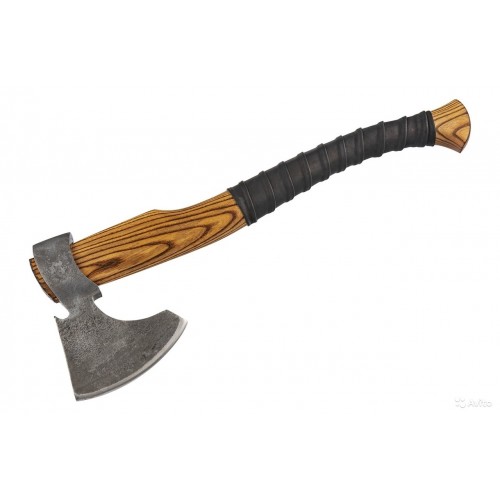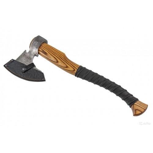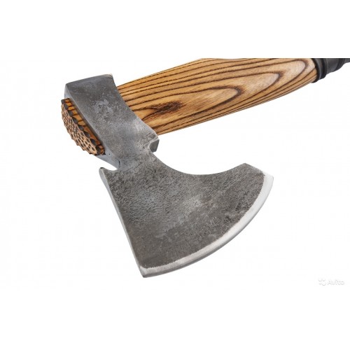 Модель топора №1 Дерево ясень Длина ручки 50 см Высота клинка 185ммДлина режущей кромки 140 мм Сталь – углерод 58-59 единиц калки ХВГОбмотка ручки из кожи Кожаный чехол